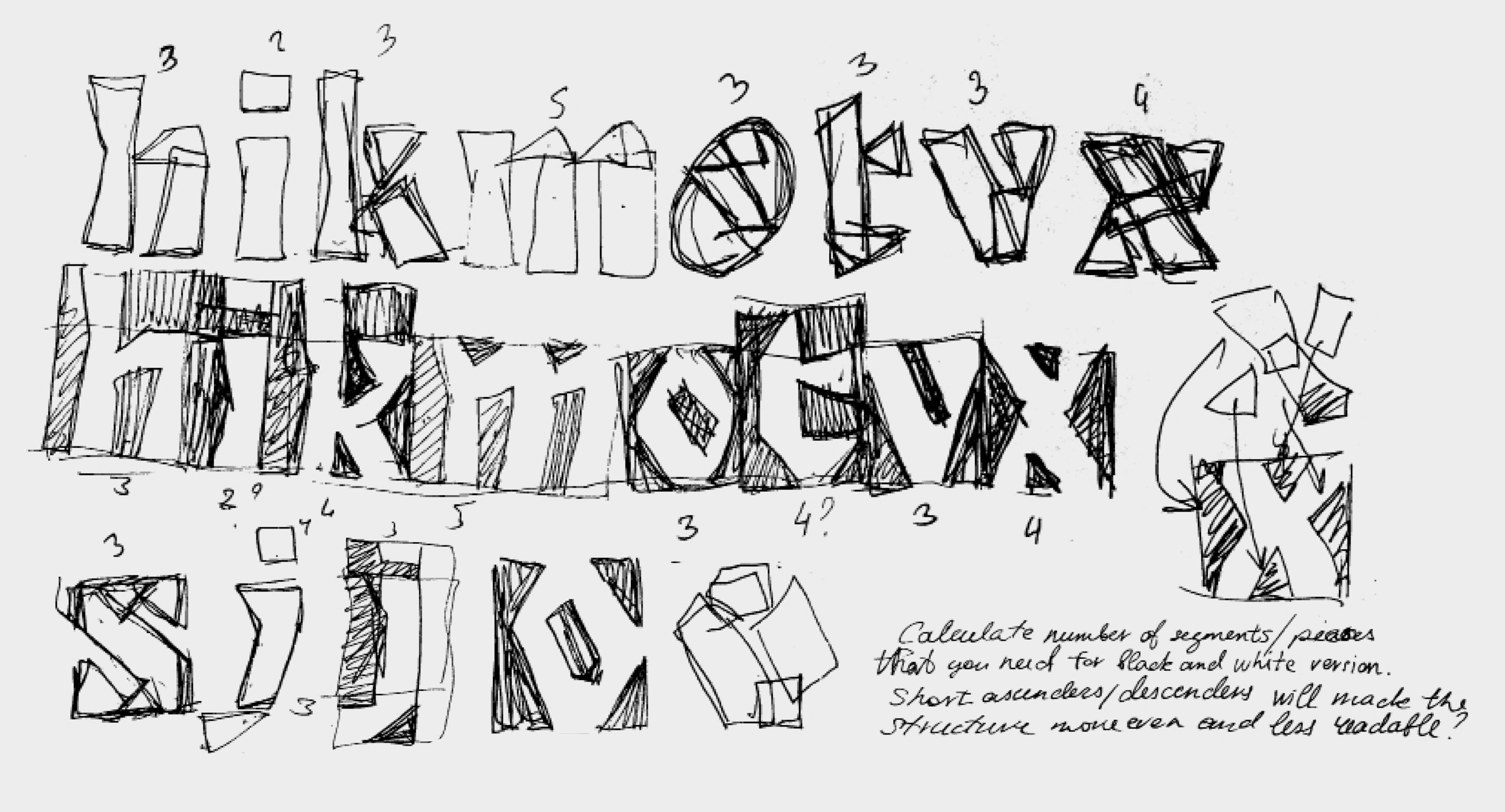 Some letters have a very simple form but a much more complex counter-form. We can write the letter “n” in two moves, but to draw it using only counter-shapes, we need at least three segments. To balance this difference in complexity, I split some strokes into smaller parts.