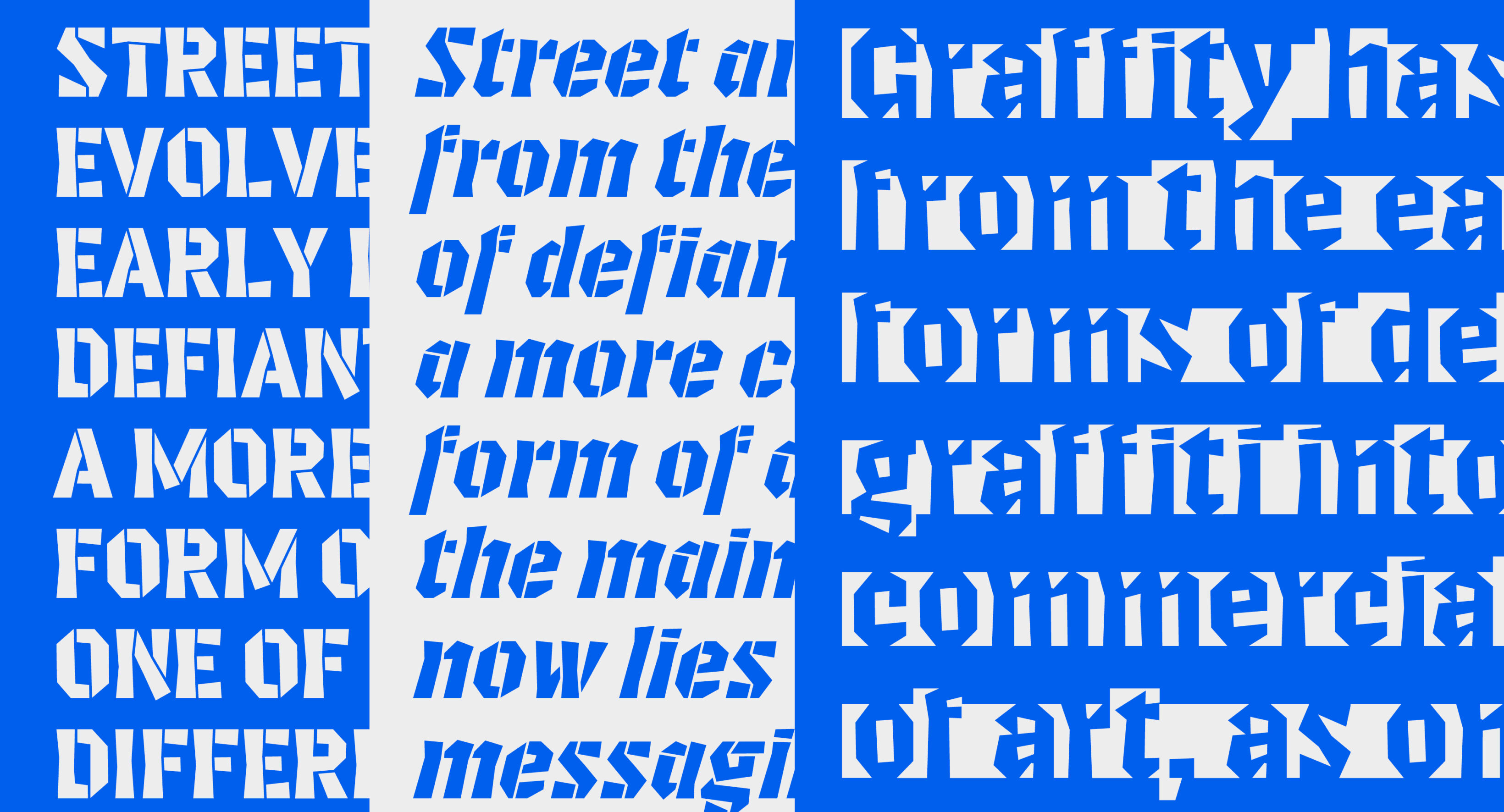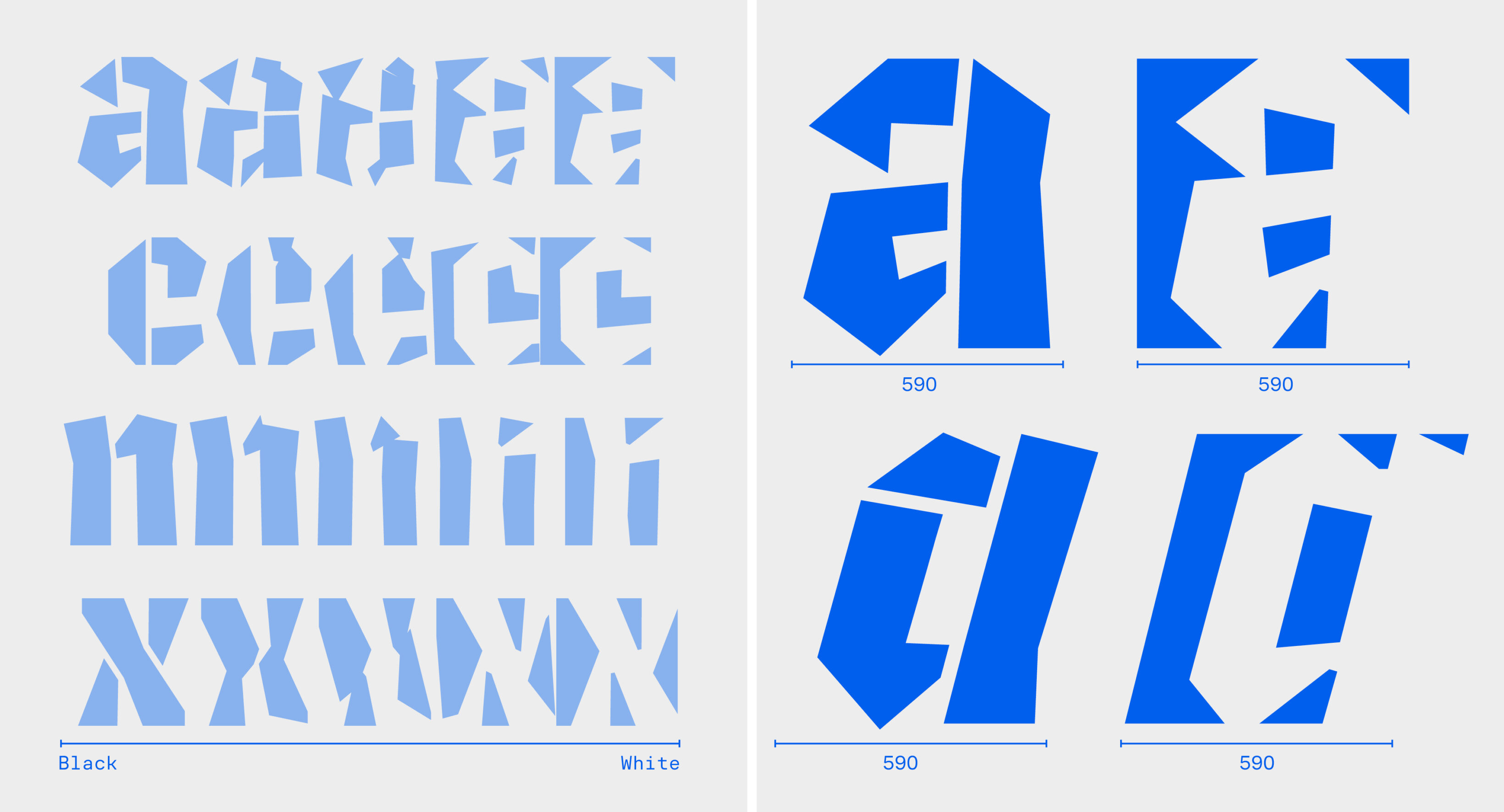 As a result, the already brutal, sharp, and geometric forms took on new associations—street art, graffiti, and strong visual statements. This was an unexpected connection, but it helped me define the visual language for presenting the typeface.